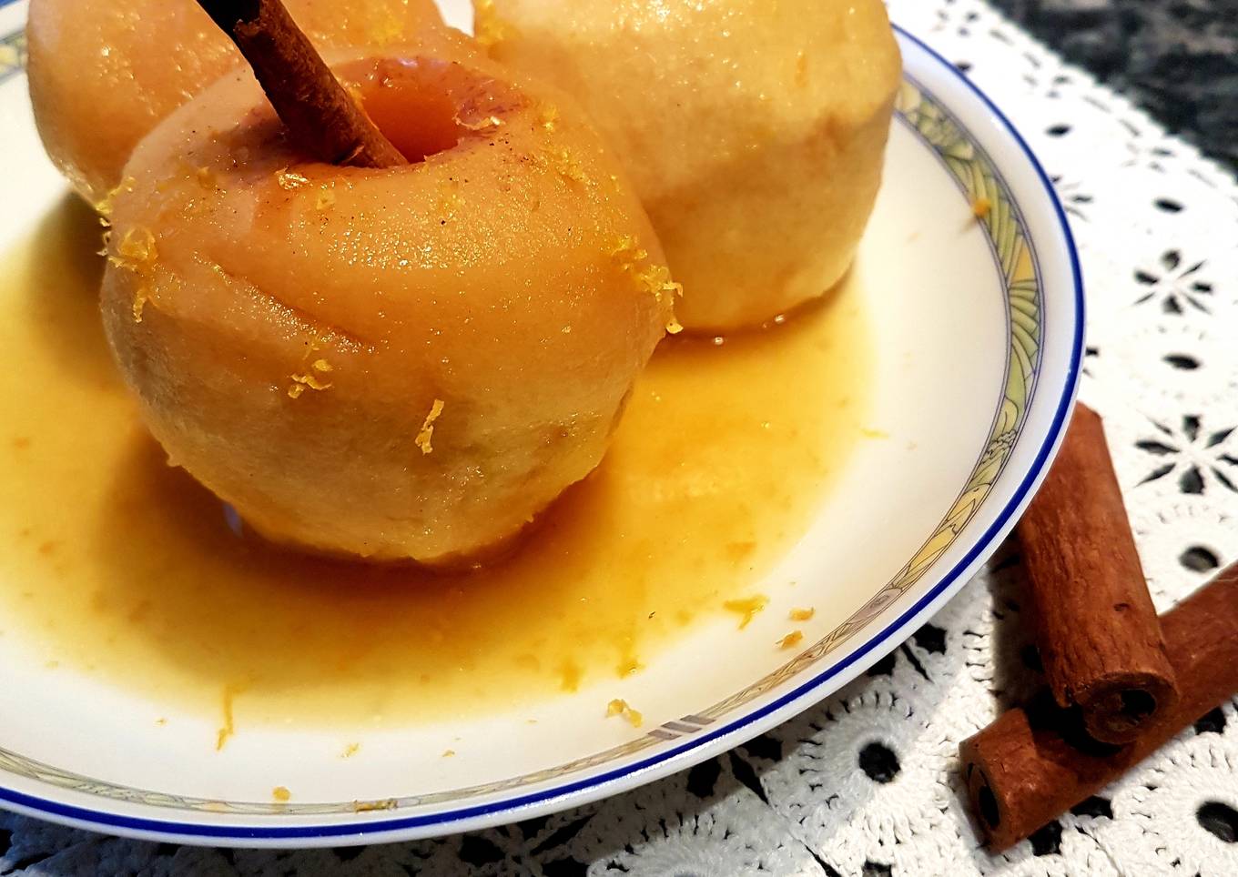 À l'aide d'un économe, épluchez les pommes et videz-les sans les abimer. Citronnez les pommes afin d'éviter qu'elles noircissent. Réservez. Dans une casserole, versez le jus et le zeste des oranges, les épices, le beurre, le sucre et le miel. Faites chauffer ce mélange très légèrement. Placez les pommes dans un plat allant au four, arrosez-les avec le jus précédemment obtenu. - Recouvrez le plat de papier aluminium et enfournez pendant 2 heures en baissant la température à 120°C. Durant la cuisson, sortez le plat du four et retournez les pommes de manière à avoir une cuisson régulière.